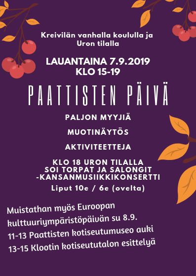 Kulttuurin merkeissä jatketaan sunnuntainakin 8.9. kun koko Suomen valloittaa Euroopan kulttuuriympäristöpäivä ja tämän tiimoilta Paattisten kotiseutumuseo on auki klo 11.00-13.00 ja Klootin kotiseututalo klo 13.00-15.00.